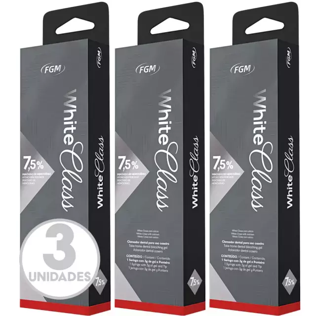 O Whiteness Class 7,5% FGM com 3 seringas é um gel clareador dental especialmente desenvolvido para oferecer clareamento gradual e confortável, ideal para pessoas com dentes sensíveis ou que preferem um tratamento mais leve. Sua fórmula combina peróxido de hidrogênio a 7,5%, pH neutro e alta viscosidade, proporcionando segurança, estabilidade e eficácia ao longo de todo o processo.