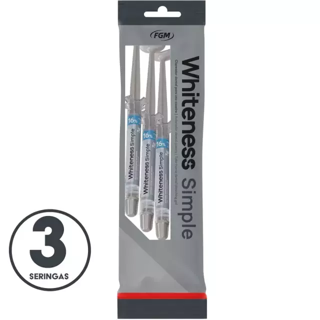 O Whiteness Simple 16% FGM com 3 seringas é um gel clareador dental desenvolvido para promover clareamento rápido e seguro no ambiente domiciliar, com fórmula à base de peróxido de carbamida a 16%. O produto oferece resultados visíveis em poucos dias, mantendo o conforto e a proteção do esmalte dentário.