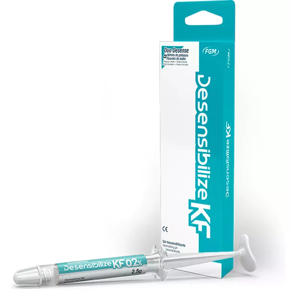 O Desensibilize KF 0,2% FGM é um gel dessensibilizante especialmente desenvolvido para o controle da sensibilidade dental provocada por procedimentos de clareamento, desgaste do esmalte, retração gengival ou outros estímulos externos. Sua fórmula combina nitrato de potássio e fluoreto de sódio, dois ativos com comprovada ação na redução da dor associada à hipersensibilidade dentinária.